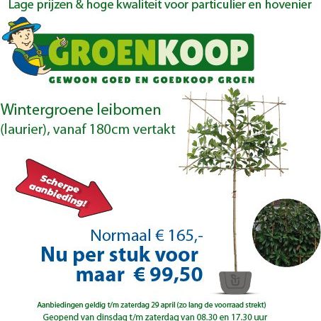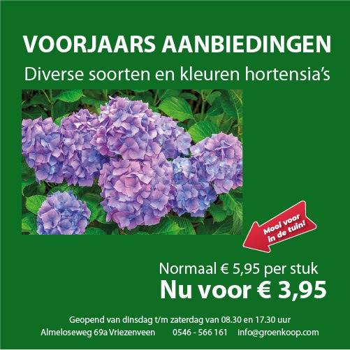 Het voorjaar laat zich nu echt zien! En daarom hebben we nu Voorjaarsaanbiedingen: Hortensia's in diverse soorten en kleuren van €5,95 voor €3,95 p/stuk en Wintergroene leibomen (Laurier), vertakt vanaf 180cm, normaal €165,- per stuk, nu voor €99,50 p/stuk! Graag zien we u aan de Almeloseweg 69a in Vriezenveen!